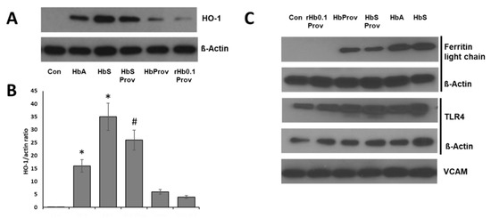 Effect of hemoglobins carrying Providence mutation on human pulmonary arterial endothelial cells. HPAECs were exposed to ferrous forms of either HbA, Providence (βK82D), HbS, HbS Providence (βE6V/βK82D), or crosslinked Providence (rHb0.1/βK82D), at equimolar concentration (100 µM) for 24 h. (A,C) Cell lysates were immunoblotted with primary antibodies against HO-1, ferritin light chain (L-ferritin), toll-like receptor 4 (TLR4), and vascular cell adhesion molecule 1 (VCAM). Equal loading was confirmed by re-probing the blots against β-actin. All immunoblot panels shown are representatives of three separate independent experiments. (B) Densitometric analysis was done for the HO-1 expression vs. corresponding β-actin levels and the values represent the average ratio of band intensities (HO-1:β-actin), n = 3. * p < 0.05 vs. untreated control; # p < 0.05 vs. corresponding HbS.