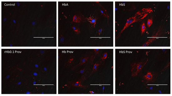 We and others have shown that cell-free Hb, especially oxidatively unstable HbS, exerts oxidative toxicity on cultured endothelial and other cells, during in vitro incubation through the release of heme, as result of oxidative changes and unfolding of the protein [18,19,21,22]. To investigate the effect of βK82D mutation on the pulmonary endothelial stress response, we incubated the Hb proteins carrying βK82D at equimolar concentration (100 µM) with cultured HPAECs for 24 h. HO-1 and ferritin proteins are the most potent indicators of heme release from Hbs and subsequent iron load within the cellular compartment, respectively [23,24]. Therefore, we first monitored the expression of the levels of these proteins in HPAECs. Exposure to either HbA or HbS (βV6E) caused a robust increase in HO-1 and ferritin expression in HPAECs (Figure 3A,C). However, HbS induced significantly higher levels of HO-1 over the corresponding HbA (Figure 3A,B). On the other hand, the βK82D mutant at equimolar concentration also caused induction of HO-1 and ferritin proteins, but at a significantly lower degree than HbA and HbS. In contrast, rHb0.1/βK82D caused no expression of ferritin and a very low level of HO-1 expression. This is consistent with the negligible levels of βCys93 oxidation in this protein (Table 1). Surprisingly, introduction of βK82D in oxidatively susceptible βE6V/βK82D caused a significant reduction in the expression of both HO-1 and ferritin compared to native HbS (Figure 3A–C). To verify this finding, we used an orthogonal approach for a visual comparison of the expression pattern of HO-1 induced by HbS and HbS carrying the βK82D mutation. As seen in our immunoblotting experiment, HbS induced stronger expression of HO-1 (indicated by red fluorescence) than corresponding HbA in HPAECs (Figure 4). Whereas, βE6V/βK82D caused much lower levels of HO-1 expression than βE6V (Figure 4).