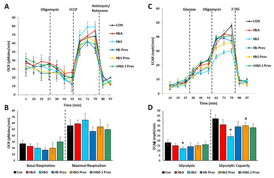 The OCR and ECAR values were plotted using the XF24 software, version 1.8. To eliminate any background OCR or ECAR, few blank wells with Hb variants were also run. Various bioenergetic and glycolytic parameters were calculated following the manufacturer’s protocol and as described earlier [49]. In brief, basal respiration was considered as the difference between maximum OCR obtained before oligomycin addition and non-mitochondrial OCR obtained after rotenone/antimycin A, whereas the maximal respiration was the difference between maximum OCR induced by FCCP and non-mitochondrial OCR. Similarly, glycolysis was considered as the maximum ECAR obtained after addition of glucose and the glycolytic capacity was the maximum ECAR achieved by oligomycin addition that shuts down ATP generation oxidative phosphorylation.