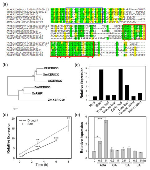 PtXERICO, a RING-H2 zinc finger from Populus trichocarpa, is orthologous to XERICO of Arabidopsis. (a) Amino acid sequence alignment of PtXERICO and related proteins from Arabidopsis (AtXERICO), soybean (GmXERICO), maize (ZmXERICO, ZmXERICO1) and rice (OsRHP1). Complete amino acid sequences were aligned using ClustalW. Putative transmembrane domains identified using TMHMM2.0 are indicated by blue box. RING-H2 zinc finger domains are identified by a red box and position of C and H by red arrowheads. Identical amino acids were shown in green while yellow colors indicate similar amino acids. (b) Phylogenetic analysis of proteins from (a). The rooted phylogenetic tree was constructed using a Neighbor-Joining method (1000 bootstrap replicates) and Jones-Taylor-Thornton (JTT) model in MEGA 7.0 (Kumar et al. 2016). (c) Tissue preferential expression of PtXERICO in P. trichocarpa. Plot was reconstructed from the public data from Phytozome (https://phytozome.jgi.doe.gov/pz/portal.html#!gene?search=1&detail=1&method=3252&searchText=transcriptid:27033190). (d,e) Expression of PtXERICO under the drought and salt stress (d) and hormone treatment (e). Four-week-old hybrid poplars (Populus alba × P. glandulosa, clone BH) grown in test tube were used (see, Methods). Student’s t-test, * (p < 0.05), ** (p < 0.01), and *** (p < 0.001).