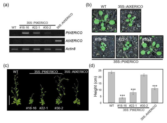 Overexpression of PtXERICO in Arabidopsis results in growth retardation. (a) Expression of PtXERICO transcripts in transgenic Arabidopsis plants (35S::PtXERICO). Transgenic Arabidopsis overexpressing XERICO of Arabidopsis (35S::AtXERICO, line SS8-3; Ko et al., 2006) was used as a positive control. Semi-quantitative RT-PCR (26 cycles) was performed using cDNA templates generated from leaf total RNA. The Actin8 (At1g49240) gene was used as a loading control. (b,c) Growth retardation in both 35S::PtXERICO and 35S::AtXERICO plants. Twenty-day-old soil-grown plants (b) and fifty-day-old adult plants (c). Scale bar, 10 cm. (d) Quantification of plant growth. Heights of plants from (c) were measured. Error bars indicate standard error (n = 10). Student’s t-test, *** (p < 0.001).