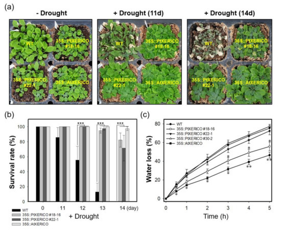 Survival rate (%) was measured at 0, 11, 12, 13 and 14 days after drought treatment by counting dead Arabidopsis plants. Completely dried plants of WT, 35S::PtXERICO, and 35S::AtXERICO that are not revived after re-watering were considered as dead plants.