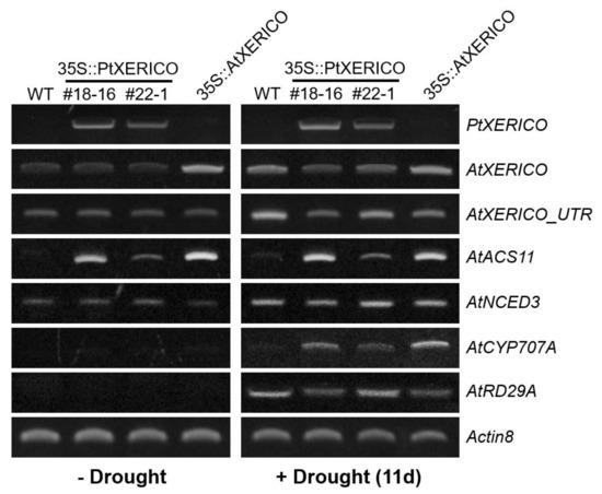 To validate the drought stress tolerance of the 35S::PtXERICO plants (Figure 4), we examined the transcriptional regulation of PtXERICO and genes related to drought and ABA metabolism. Expectedly, upregulation of PtXERICO was shown in 35S::PtXERICO plants (#18-16 and #22-1) regardless of drought stress, like as AtXERICO in 35S::AtXERICO plants (Figure 5). Expression of endogenous AtXERICO is clearly upregulated by drought stress in WT plants, which was confirmed by employing a 3′-UTR primer of AtXERICO gene in the RT-PCR (Figure 5, AtXERICO_UTR). Interestingly, in the 35S::PtXERICO (#18-16) plants under drought stress conditions, the endogenous AtXERICO expression is not upregulated significantly, suggesting the orthologous function of PtXERICO to AtXERICO. Accordingly, AtACS11 (1-AMINOCYCLOPROPANE-1-CARBOXYLATE SYNTHASE 11, At4g08040) was highly expressed in both the 35S::PtXERICO and 35S::AtXERICO plants, regardless of drought stress (Figure 5). AtACS11 was found as the most highly upregulated gene in the whole transcriptome profiling data of 35S::AtXERICO compared to WT [18].