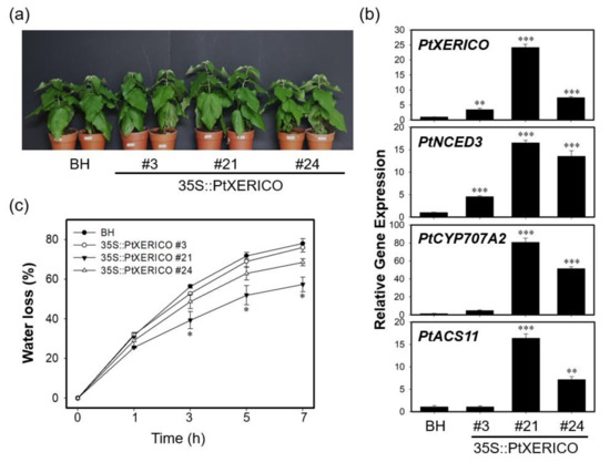 The significance of PtXERICO function was further characterized by generating transgenic poplar trees overexpressing PtXERICO (Figure 6). Hybrid poplars (Populus alba × P. glandulosa) were used in both wild type (clone BH) and transgenic plant experiments, respectively (see materials and methods). For comparative phenotypic analysis, we chose three lines of 35S::PtXERICO poplar trees (#21, high-level; #24, medium-level, and #3, low-level expression) based on their expression level of introduced PtXERICO gene (Figure 6a,b). Although no apparent phenotypic changes were observed in 35S::PtXERICO poplar trees compared to BH (Figure 6a), expression of genes involved in ABA homeostasis (i.e., PtNCED3 and PtCYP707A2) were greatly upregulated, proportionally to the expression level of the introduced PtXERICO (Figure 6b). PtNCED3 (Potri.011G112400.1) and PtCYP707A2 (Potri.001G242600.1) were selected as the closest homologs of Arabidopsis NCED3 (At3g14440) and CYP707A2 (At2g29090), respectively. In addition, we tested the expression of the PtACS11 (Potri.002G113900.1) gene in our 35S::PtXERICO poplar trees as an ACS11 (At4g08040). Consistently, PtACS11 was highly upregulated in the 35S::PtXERICO poplar tree (line #21) (Figure 6b).
