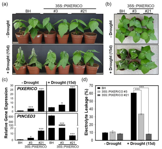Under environmental stresses, such as drought and salinity, plant cell membranes are damaged and lose their integrity. Thus, electrolyte leakage is increased [25]. However, under drought stress, 35S::PtXERICO poplar tree (#21) exhibited almost no changes of electrolyte leakage in the leaves, while BH showed a dramatic increase in electrolyte leakage from approximately 10% to 61% (Figure 7d). Thus, these results suggest that overexpression of PtXERICO reduces membrane damage caused by drought stress.