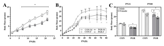 PGR significantly (p < 0.001) decreased the growth rate from PN1–21 (PGR; males: 0.318 ± 0.017 g∙day−1 and females: 0.314 ± 0.016 g∙day−1) when compared with the CON group (males: 0.534 ± 0.013 g∙day−1 and females: 0.516 ± 0.022 g∙day−1), with no sex effect present (Figure 1A). PN21 body mass of PGR mice (males: 8.6 ± 0.731 g and females: 8.3 ± 0.518 g) was significantly less (p < 0.001) than for the CON mice (males: 12.7 ± 0.331 and females: 12.1 ± 1.132 g; Figure 1C), with no sex effect.