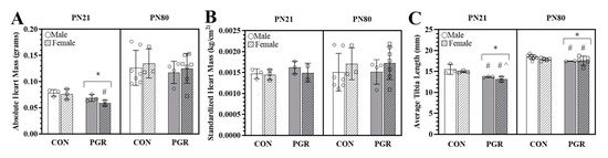 Effects of PGR on heart mass and tibia length: (A) absolute heart mass (PN21/PN80): The PN21-PGR group (n = 6) was significantly reduced compared to CON (n = 6); (*: p = 0.01). PGR-F were significantly less than CON-M (#: p = 0.05) but not less than CON-F (p = 0.09). PN80-PGR was not significantly (p > 0.05) different from the CON group, and no sex effect was present. (B) Standardized heart mass (PN21/PN80): no significant differences (p < 0.05). (C) Tibia length (PN21/PN80): PGR significantly reduced average tibia length compared to the CON group at PN21 (CON: n = 6, PGR: n = 6) and PN80 (CON: n = 12, PGR: n = 7); (*: p < 0.001), with no sex effect present at PN21. At PN80, a diet x sex interaction (#: p = 0.04) revealed the tibias of PGR-M and -F were smaller than CON-M but not CON-F (^: p < 0.01). Values are mean ± SD.