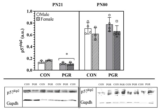 Western blotting protein abundance of p57kip2: PN21; p57kip2 PGR (n = 6) abundance was significantly less than for CON (n = 6); (*; p = 0.007). At PN80, no significant differences were seen, as abundance is recovered (p > 0.05; CON: n = 7, PGR: n = 9). Values are mean ± SD. The blots below the bar graphs are contiguous, representative bands selected from the gels.