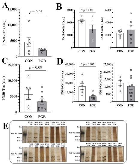 At PN21, Ttn abundance was reduced but not significant (p = 0.065, Figure 4A) in PGR (2015 ± 484.6 a.u.) vs. CON (4549 ± 3734 a.u.).