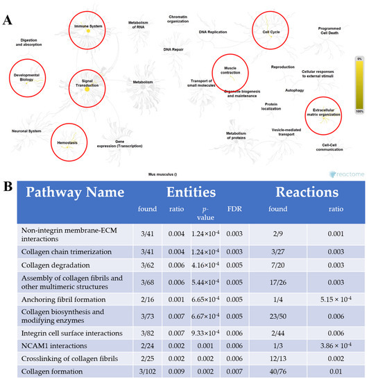 Using REACTOME software, 42 pathways were associated with the five proteins from 2D DIGE (p57kip2, Ttn, Col1a1, Col3a1). The identified hubs (a combination of interactors, entities, and reactions) included extracellular matrix organization, cell cycle, muscle contraction, signal transduction, developmental biology, immune system, and hemostasis (Figure 5).
