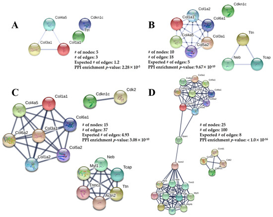 The Protein-Protein Interaction (PPI) networks constructed by the STRING database for the differentially abundant proteins from PGR and CON mouse hearts. The networks consist of the total number of nodes (proteins involved), number of edges (PPI connections amongst nodes), and a PPI enrichment p-value. The expected number of edges provides how many edges are anticipated if the nodes were selected at random. (A) No interactors. (B) Five predicted protein interactors added. (C) Ten predicted protein interactors added. (D) Twenty predicted protein interactors added. The spheres represent the proteins and the line thickness represents the PPI-associated degree of evidence (combination of gene fusion, gene neighborhood, gene co-occurrence, experimental evidence, text-mining evidence, database evidence, and co-expression evidence). The information inside of the circle describes the protein structure and the color of the nodes is for visual representation.