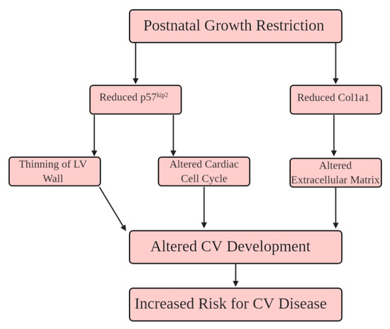 While there is extensive evidence on CV pathology due to intrauterine growth restriction [13,14,15,16], there is far less on the dysfunction caused by postnatal growth restriction (PGR). From the evidence available, PGR in a mouse impairs cardiac function due to a greater amount of mononucleated cardiomyocytes [7,17], impaired calcium flux [17], stiffer ventricles leading to diastolic dysfunction [7], and increased incidence of cardiac arrhythmias [12] when compared to non-growth restricted mice.