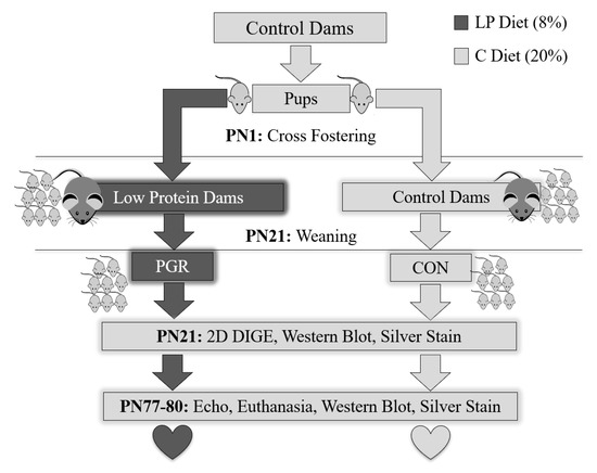Experimental design. Two weeks prior to mating, dams were fed either a control diet (C: 20% protein) or isocaloric low-protein diet (LP: 8% protein). At birth, pups born to LP dams were sacrificed, while CON pups were cross-fostered to either a different control-fed dam (CON group) or a low-protein-fed dam (PGR group). At PN21, mice were weaned, a sub-cohort was euthanized, and hearts collected for 2D DIGE, western blotting, and silver nitrate staining (CON; n = 3 males; n = 3 females and PGR; n = 3 males; n = 3 females). PGR was restricted to the developmental window of PN1–21 as the remaining mice were fed the C diet from PN21–PN80. At PN77, cardiac function was evaluated by echocardiography (CON; n = 4 males; n = 3 females and PGR; n = 4 males, n = 5 females). Mice were given 2 days of recovery, then at PN80 were euthanized and hearts extracted for western blotting and silver nitrate staining.