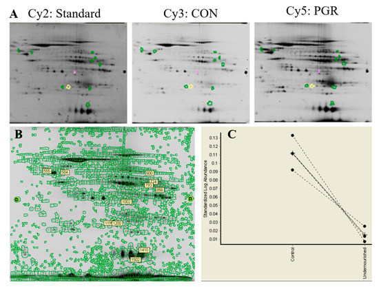 Representative image from DeCyder software: (A) Six gels were CyDye-labeled through 2D DIGE three-dye methodology. (B) Of the 2187 total spots identified, two spots were determined to have significant differential abundance (p < 0.05); three spots with a p-value of 0.05–0.075 were also robotically picked and digested, illustrated by the green, yellow, and pink circles in panel A. (C) The graphical view from the DeCyder software shows the standardized log abundance between the CON and PGR of the protein spot that was selected.