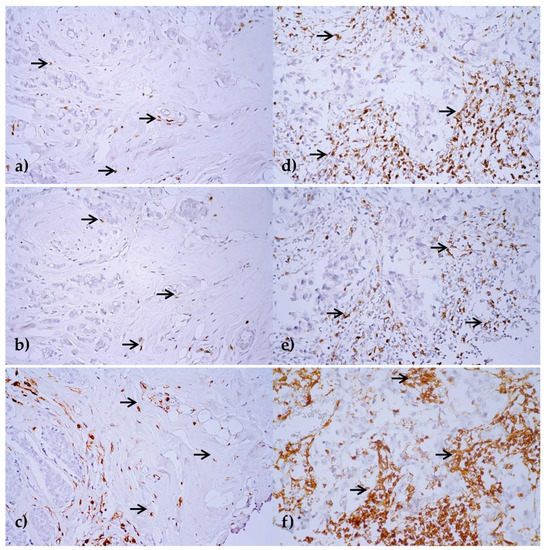 Immunohistochemical expression of CD3 (a,d), CD8 (b,e) and CD45RO (c,f) in stromal tumor-infiltrating lymphocytes (TILs). Breast cancer tissue areas with low (a–c), and high stromal TIL (d–f) infiltration are marked by arrows. Original magnification ×400, visualization with 3,3′-diaminobenzidine.