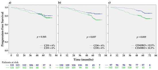 Based on the ROC curve analysis (Figure S1a–c), the values of CD3 above 6% were defined as CD3high, values below 6% as CD3low. Similarly, the values of CD8 above 6% were defined as CD8high, values below 6% as CD8low. Finally, the values of CD45RO above 12.5% were defined as CD45ROhigh, values below 12.5% as CD45ROlow. Those values represent cut-offs for further analysis.