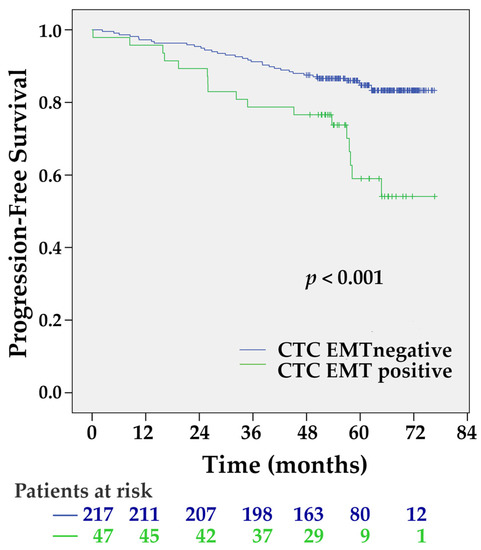 The Kaplan-Meier PFS estimates for circulating tumor cells (CTC) epithelial-to-mesenchymal transition (EMT). CTC EMT positive patients had significantly shorter PFS (p < 0.001 by the Log-rank test).