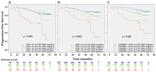 The Kaplan-Meier PFS estimates for CTC EMT stratified by individual stromal TILs categories. CTC EMT positive patients with (a) CD3high, (b) CD8high, and (c) CD45ROhigh stromal infiltration had significantly shorter PFS than all other combinations (p ≤ 0.001 for CD3, CD8, and CR45RO, respectively, by the Log-rank test).