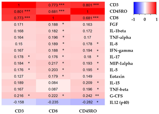 Heatmap showing correlation coefficients for significant correlations (highlighted by asterisks) found between CD3, CD8, and CD45RO TILs infiltration (%) and plasma concentrations of selected cytokines (pg/mL).