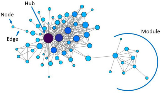 Example of a network, indicating nodes, edges, centrally located genes (hubs) and groups of tightly connected genes (modules).