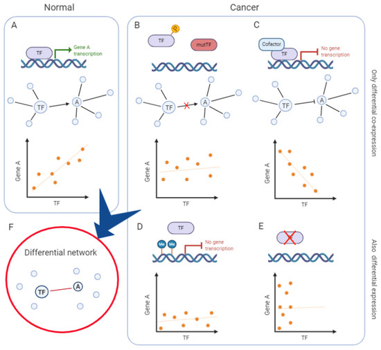 Mechanisms underlying differential co-expression and their impact on transcripts’ correlation. Example of a simplified network in normal tissue (A) and in cancer (B–E), whose comparison leads to defining a differential network (F). (A) Example of a simplified co-expression network in normal tissue, with a transcription factor (TF) activating its target, gene A. The TF and A are connected by an edge and their expression is positively correlated. (B) Post-translational modifications (e.g., phosphorylation) or mutations of the TF impede its binding to gene A promoter. Hence, the TF does not activate gene A expression: they are not transcriptionally correlated and therefore not linked in the co-expression network. (C) The presence of a cofactor alters the activity of the TF, that switches from acting as an activator to being a repressor of gene A expression. Hence, the TF and gene A are negatively correlated. In the network, they can be represented as having an inhibitory edge or as not being linked. (D) Epigenetic mechanisms (e.g., DNA methylation) inhibit the TF binding and gene A expression. The TF and gene A are not correlated and they are not linked in the co-expression network. (E) In the absence of TF expression, gene A expression does not depend on its regulatory activity. The TF and gene A are not correlated nor linked in the co-expression network. These regulatory mechanisms and others alter the relationships between the TF and gene A, changing their correlation at the transcriptional level. In some cases, one of the two genes is also differentially expressed (D,E), in other cases, only co-expression changes (B,C). Reconstructing the differential network between “normal” and “cancer” conditions, exemplified here, would lead to defining a network where only the TF and gene A are linked by an edge, indicating a decreased correlation in cancer (F).