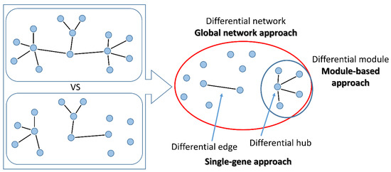 - “global network” approaches aim at reconstructing the whole differential co-expression network between two or multiple conditions. Global features of the differential network can be studied, such as edge distribution, modularity or entropy.