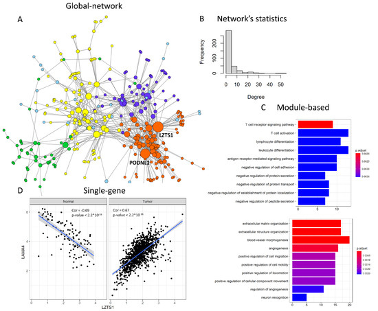 Usually, these methods take as input two or multiple gene expression datasets that the user wishes to compare, and give as output either a network of dysregulated connections (“global network” approach), a list of genes belonging to a dysregulated module (“module-based” approach) or a ranking of dysregulated nodes (“single-gene” approach). The dcanr package [103], implementing 11 different “global network” differential co-expression approaches, is particularly handy and well documented. An example of the kind of output obtained through this tool is shown in Figure 4, where the genes most significantly increasing their co-expression between normal breast and breast tumours in the TCGA (The Cancer Genome Atlas) cohort, identified via the z-score algorithm [61], are represented in a network with Cytoscape [101] (Figure 4A). Statistics on a network’s properties indicate overall differences in connectivity between the two conditions, showing that the differential network follows a power law, with a few genes having many connections and many genes having a few connections (Figure 4B). This network can be further dissected to gain module- and gene-level information through gene clustering and node-level statistics obtained, for example, with the igraph R package [104]. Modules can then be studied through functional enrichment with tools such as clusterProfiler [105] (Figure 4C). In this case, four modules with at least 20 nodes are detected, and the two largest modules show enrichment for immune-related and extracellular matrix/angiogenesis Gene Ontology categories, respectively. Alternatively, modules can be found via methods explicitly designed for differential modules’ detection, such as DiffCoex, which builds upon the widely used gene co-expression reconstruction method WGCNA (Weighted Gene Co-expression Network Analysis) [106]. DiffCoex, also implemented in the dcanr package, takes as input two expression matrices (e.g., normal and tumour) and identifies differentially co-expressed modules via the clustering of genes based on correlation differences across conditions. Finally, differential edges displaying the strongest change in correlation can be selected from the whole differential co-expression network in a “gene-specific” perspective (Figure 4D). In this example, LZTS1, having 54 edges, is the top differentially connected gene, followed by PODNL1 (Figure 4A), and it shows a strong change in relationship with its network neighbor LAMA4, switching from negative to positive correlation in normal tissue and breast tumour, respectively (Figure 4D).