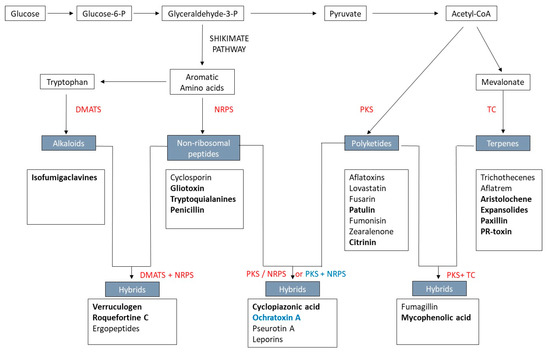Biosynthetic pathways of secondary metabolites. In grey boxes, the typical backbone of secondary metabolites. In grey, the main mycotoxins produced by these pathways. In red, the enzymes associated with each pathway. In blue, separate PKS and NRPS are involved in ochratoxin A (OTA) biosynthesis; NRPS: non-ribosomal peptide synthetase, PKS: polyketide synthase, TC: terpene cyclase, DMATS: dimethylallyl tryptophan synthase. In bold, mycotoxins produced by Penicillium species.
