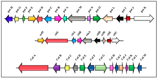 Gene clusters of the patulin biosynthesis pathway (the first one at the top) (15 genes, 40 kb) [39] and the citrinin biosynthesis pathway (the middle group) (nine genes, 22 kb) [40,41] in Penicillium expansum; cluster of the calbistrin biosynthesis pathway (the third one at the bottom) (13 genes, 35kb) in Penicillium decumbens [42].