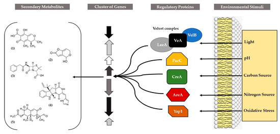 Global regulatory proteins involved in the regulation of gene clusters involved in the production of various secondary metabolites in Penicillium (1) citrinin, (2) patulin, (3) penicillin G, (4) roquefortine C, and (5) PR-toxin, adapted from Brakhage [45].