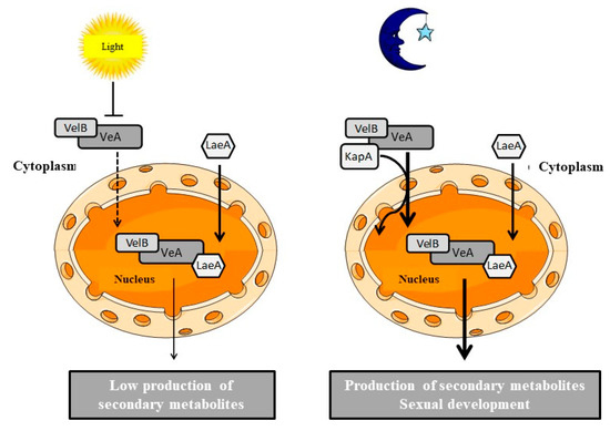 Operating model of the velvet complex in Aspergillus nidulans adapted from Bayram et al. [127]. In the presence of light, VeA is retained in the cytoplasm (-----), and LaeA has low activity. In the dark, VeA coupled to VelB is transported in the nucleus by the importin α KapA (——), and the velvet complex is formed with LaeA to activate the production of secondary metabolites and sexual development.