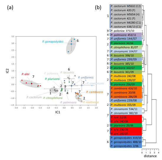 Shotgun proteomics-based clustering of Phytophthora isolates. (a) Independent component analysis of 1787 MS1 peak areas (intensity threshold—0.1% of the total ion chromatogram). Circles, diamonds, error bars and the gray shading represent mean profiles of two biologically distinct samples, means, standard deviation, and significant clustering of the species (p < 0.05; Kruskal–Wallis), respectively. Numbers indicate recognized Phytophthora clades, color corresponds to the individual species; (b) Clustering analysis based on IC1 and IC2 coordinates.