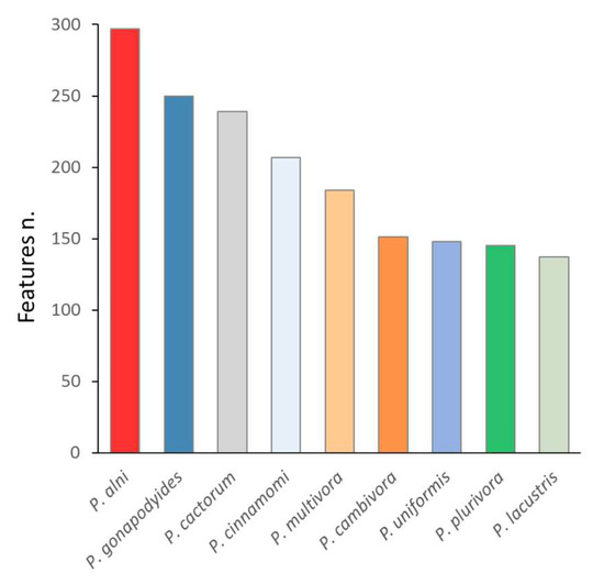 Species-specific patterns found in mycelium proteomes. Number of identified features showing statistically significant differences (Kruskal–Wallis test, p < 0.05) in contrast to all other analyzed species with at least three different isolates. Color corresponds to individual species (Figure 1). See Supplementary Table S2 for details.