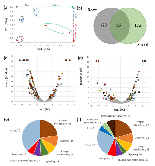 Barley proteome response to P. palmivora. (a) The proteome profile separation of P. palmivora-treated and mock-treated samples. Principal component analysis based on differentially abundant proteins in shoots and roots. Results of four biological replicates represent proteins with at least two matched unique peptides. Mock-treated plants (blue) and plants inoculated with P. palmivora (red) are indicated. Circles represent statistically significant separation (Kruskal–Wallis test, p < 0.05), black and green color corresponds to root and shoot tissue, respectively. (b) The overlap between differentially abundant proteins in shoots and roots (absolute fold change FC > 1.5; p < 0.05). (c–f) Volcano plot representation and functions of P. palmivora response proteins in barley roots (c,d) and shoots (d,f). Only categories represented by more than nine proteins are highlighted. The color of spots representing differentially abundant proteins in panels (c,d) corresponds to categories highlighted in (e,f).