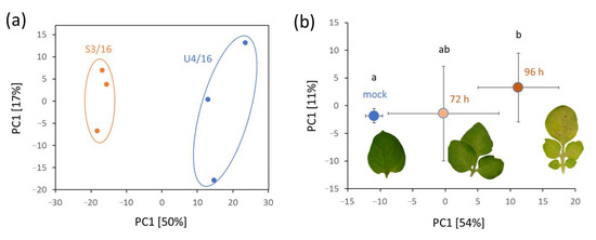 The initial mycelia screening experiment targeted species associated with tree disease, and therefore P. infestans was not included in the dataset. Thus, mycelia of two different P. infestans isolates were sampled and analyzed, providing the reference dataset and quantitative data for more than 2000 proteins (Supplementary Table S6). Differences in the MS analysis did not allow the integration of these data into the original screening, but the separation of isolates was clearly visible, providing further evidence of the phylopeptidomics-based subspecies identification (Figure 4a). Next, the detached leaves of S. tuberosum (cv. Kerkovske rohlicky) were inoculated with a mixture of P. infestans isolates as described in Materials and Methods. Leaf samples were collected 72 and 96 h after the inoculation, and proteome profiles were compared to the mock-treated leaves (sampled after 96 h). More than 900 putative P. infestans proteins were detected in the plant tissue extracts, and proteome profiles showed a clear correlation with the infection progress, separating inoculated and mock-treated samples in the first PCA component (Figure 4b).