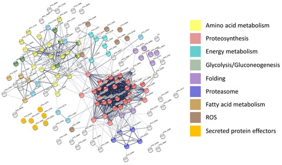 The set of 146 high-confidence P. infestans proteins (containing at least two detected unique peptides and not identified in the mock-treated samples; Supplementary Tables S7 and S8) were analyzed in detail. Functional enrichment by String (Figure 5) showed that these were enzymes belonging to amino acid metabolism, ribosomal proteins, ROS metabolism enzymes, CAZymes, and components of proteosynthetic machinery and proteasome. Surprisingly, only six detected proteins were annotated as secreted effectors, namely protein elicitin (XP_002906009.1), two protoplast-secreted proteins (XP_002899456.1; XP_002899435.1), RxLR effector peptide protein (XP_002897665.1; XP_002903512.1), and a cysteine-rich secreted protein (XP_002898542.1). The comparison of the datasets revealed positive and negative correlations with pathogen exposure time for 37 and 2 proteins, respectively (Table S7). However, statistically significant differences between 72 and 96 h treatments (absolute fold change FC > 1.5; p < 0.05) were found only for five accumulated proteins (acetyl-coenzyme A synthase, XP_002909294.1; ATPase, XP_002896250.1; subunit of translation initiation factor 3, XP_002903574.1; and two proteins of unknown function, XP_002998370.1 and XP_002909937.1) and one depleted protein (60S ribosomal protein, XP_002909966.1).