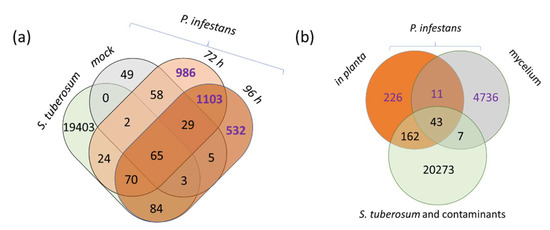 Venn diagram representation of identified peptides in inoculated detached leaves (a) and in leaves from the field experiment (b). Mock, 72 h and 96 h, in planta, mycelium—peptides found in the search against the P. infestans database in the respective sample group; S. tuberosum—peptides found in the search against the S. tuberosum database and common contaminants database. Purple color-coding indicates peptides unique for P. infestans proteome. See Supplementary Tables S7 and S8 for details.