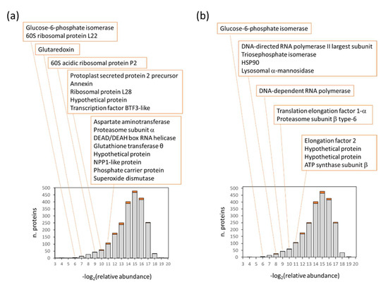 Relative abundance distribution of 2282 P. infestans proteins quantified in mycelium and highlighted proteins (orange) found in inoculated detached leaves (a) and in the field-grown plants (b). Proteins representing 1.6–0.05% of total protein abundance in mycelium are listed.