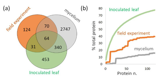 The comparison of P. infestans proteins found in all three datasets. (a) The overlap between identified P. infestans proteins and (b) the contribution of the most abundant P. infestans proteins found in the inoculated detached leaves (green) to the total Phytophthora protein content in leaves from the field experiment (orange) and mycelium (gray). See Supplementary Table S12 for details.