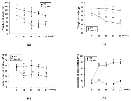 The constipation phenotypes in an animal model were determined based on several key factors, including the defecation delay, alteration of the stool parameters, and detection of histopathological changes [6,7]. In each GEM model, however, the phenotypical factors for the symptoms of constipation varied widely, and their age was not matched between studies. BNDF +/−mice showed an approximately 39% decrease in stool frequency, 4% stool water content, and 75% gastrointestinal transit in eight-week-old mice, whereas Nrp1SMKO mice exhibited an approximately 80% lower stool number and 27% smaller colon length [6,9]. An approximately 51%−39% decrease in stool number, weight, and water content were detected in eight-week-old A2BAR-/- mice [10]. In addition, Tg2576 mice showed a 51–60% decrease in the stool parameters and a 70–78% decrease in the histopathological parameters at 11 months of age [7]. In this study, the stool and histopathological parameters were measured to identify constipation of Lep KO mice at 24 weeks of age. Most parameters were 44–66% (stool parameters) and 25–39% (histopathological parameters) lower in Lep KO mice than WT mice at the same age. Most results from the current study for the constipation phenotypes in Lep KO mice were similar to previous studies that analyzed the constipation phenotypes in the GEM model. In particular, the results first show that the incidence rate of constipation in Lep KO mice was maintained at 70–80% from 12 to 24 weeks. Most studies of the constipated model did not provide any scientific evidence for the incidence of constipation.