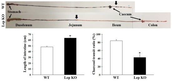 The gastrointestinal transit ratio was measured using the method described elsewhere [49]. Briefly, 24-week-old WT and Lep KO mice were fasted for 18 h before the experiment, but were given access to water ad libitum. Each mouse in the subset group was fed 1 mL of charcoal meal (3% suspension of activated charcoal in 0.5% aqueous methylcellulose) (Sigma-Aldrich Co., St. Louis, MO, USA). After 30 min of treatment, the mice were euthanized with CO2, and the intestinal tract was collected from the abdominal cavity. The intestinal charcoal transit ratio was estimated by simple calculation method as follows