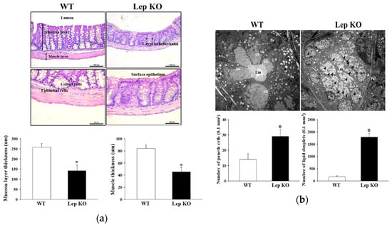 Histological structures and ultrastructure of the transverse colon. (a) The hematoxylin and eosin (H&E)-stained sections of the transverse colon from the WT and Lep KO mice were observed at 100× and 400× magnification using an optical microscope. The histopathological parameters were determined using the Leica Application Suite (Leica Microsystems). Three to five mice per group were used for histological analysis, and each parameter was measured in duplicate in two different slides; (b) The crypt ultrastructure of the transverse colon in the WT and Lep KO mice was observed by TEM at 4000× magnification. The number and size of goblet cells and the number of mucin droplets (arrowhead) per each goblet cell were determined using Leica Application Suite software. Two to three mice per group were used to prepare the TEM slide, and three parameters were assayed in duplicate in each test. The data are reported as the mean ± SD. * indicates p < 0.05 compared to the WT mice. Abbreviations: WT, Wild type; KO, Knockout type; Pn, Paneth cells; Gb, Goblet cells; Lm, Lumen.