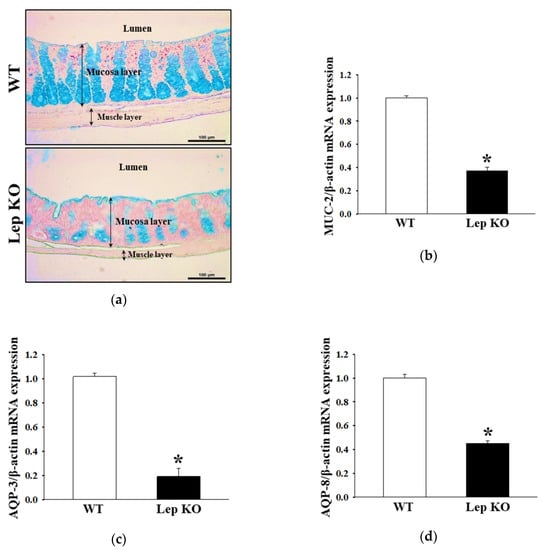 Experiments were performed to determine if the defecation delays in Lep KO mice are accompanied by changes in the regulation of mucin secretion ability and water transport in the transverse colon. The levels of mucin secretion and membrane water channel expressions were measured in the transverse colon of Lep KO and WT mice. The goblet cells stained with dark blue for mucin were concentrated in the crypts of Lieberkühn of WT mice (Figure 5a). On the other hand, this intensity decreased remarkably in the transverse colon of Lep KO mice compared to WT mice (Figure 5a). These alterations were completely reflected in the level of the mucin 2 (MUC2) transcript (Figure 5b). Furthermore, a similar regulation pattern in the levels of the aquaporin (AQP)3 and AQP8 transcripts was observed. These levels were 81.3% and 54.8% lower in the Lep KO mice than the WT mice (Figure 5c,d). These results show that the defecation delay in Lep KO mice were associated with the decreasing ability to secrete mucin and expression of a membrane water channel in the transverse colon.