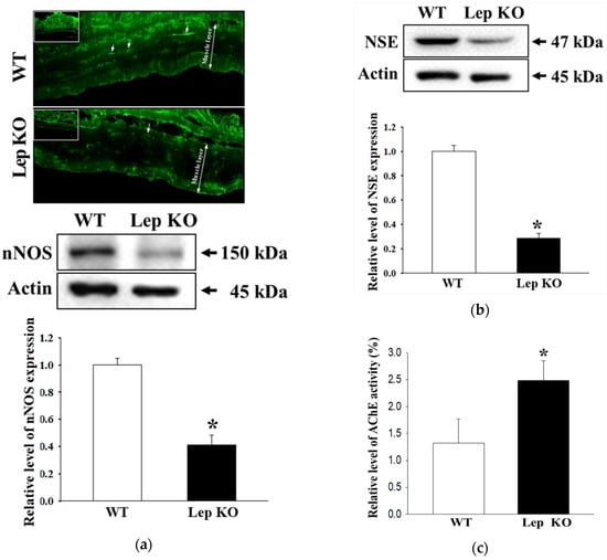 We examined whether the defecation delay in Lep KO mice are accompanied by alterations in the density and function of nitrergic enteric and myenteric neurons in the transverse colon. First, to examine the effects on the density of nitrergic enteric neurons, the distribution of neuronal nitric oxide synthase (nNOS)-stained cells and levels of nNOS expression were measured in the transverse colon of Lep KO mice because nNOS was the predominate form in enteric neurons [25,26]. Morphometric analysis of the neural population showed a lower nNOS-stained subpopulation in the smooth muscle layer of the transverse colon in Lep KO mice than the WT mice. A similar pattern was also observed in the expression level of nNOS according to Western blot analysis (Figure 6a). These results indicate that the defecation delay in the Lep KO mice may be associated with the loss of nitrergic enteric neurons, which are key players in the descending inhibitory reflex of intestinal peristalsis [25,26].