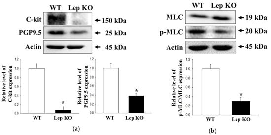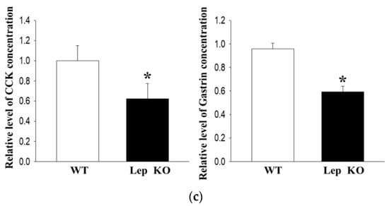 The smooth muscle contraction of the intestine is a highly interactive process, including intestinal Cajal cells (ICC), smooth muscle cell, and GI hormone [27,28,29]. To determine if the defecation delay in Lep KO mice are accompanied by changes in the smooth muscle contraction of transverse colon, alterations in the expression level of ICC markers (receptor tyrosine kinase (C-kit) and PGP9.5), smooth muscle cells marker (myosin light chain (MLC)), and concentration of GI hormone were measured in the transverse colon of Lep KO mice. The levels of C-kit and PGP9.5 expressions were lower in the transverse colon of Lep KO mice compared to the WT mice (Figure 7a). In addition, a similar decrease in Lep KO mice was detected in the phosphorylation of MLC, but the rate of the decrease was different (Figure 7b). Furthermore, the concentrations of cholecystokinin (CCK) and gastrin were lower in the transverse colon of Lep KO mice than the WT mice (Figure 7c). These results suggest that the defecation delay in Lep KO mice might be associated with the suppression of smooth muscle contractions through the dysregulation of ICC, smooth muscle cells, and GI hormone.