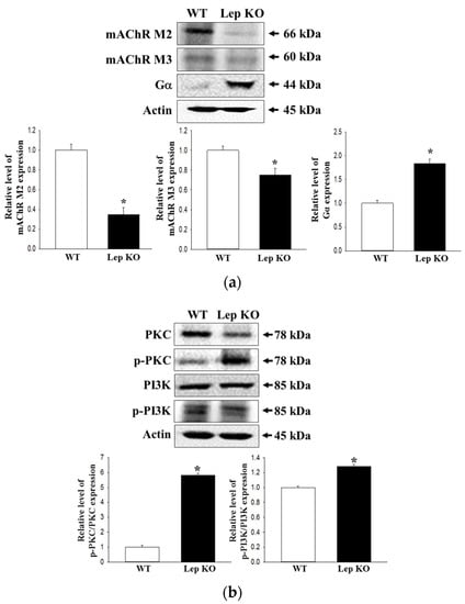 Experiments were conducted to determine if the defecation delay in Lep KO mice were accompanied by changes in the regulation of the downstream signaling pathway of mAChRs. The changes in mAChR M2, mAChR M3, Gα, protein kinase C (PKC), p-PKC, phosphoinositide 3-kinases (PI3K), and p-PI3K expression were measured in the transverse colons of a subset of groups. The levels of mAChR M2 and mAChR M3 expression were significantly lower in the Lep KO mice than the WT mice (Figure 8a). However, their downstream signaling pathway exhibited a reverse pattern in the same group. The levels of Gα expression and PKC and PI3K phosphorylation were significantly higher in the Lep KO mice, but the increase rate was varied (Figure 8b). These results show that the defecation delay in Lep KO mice may be associated with the dysregulation of the downstream signaling pathway of mAChRs.