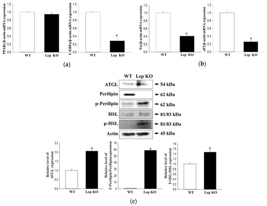 Finally, the expression levels of several key genes that adipogenesis and lipolysis in the transverse colon were measured to elucidate the correlation between constipation and increase in lipid droplet. As shown in Figure 9, significant changes were observed in the mRNA levels of the adipogenesis and lipogenesis-related genes in Lep KO mice except for peroxisome proliferator-activated receptor γ (PPARγ). The mRNA levels of CCAAT/enhancer-binding protein (C/EBP)α for adipogenesis and fatty acid-binding protein (aP2) and fatty acid synthase (FAS) for lipogenesis were significantly lower in the Lep KO mice than the WT mice. On the other hand, the expression of adipose triglyceride lipase (ATGL) and the phosphorylation of perilipine and hormone-sensitive lipase (HSL) were significantly higher in the transverse colon of Lep KO mice (Figure 9c). These results suggest that the alternative response of adipogenesis and lipogenesis in the transverse colon can contribute to the defecation delay in Lep KO mice.