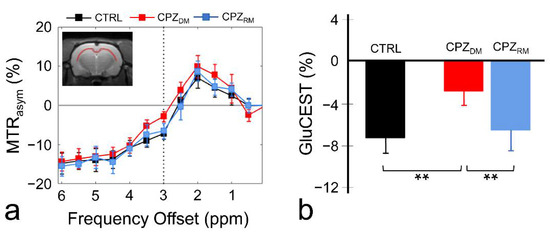 Figure 1. Magnetization transfer ratio asymmetry (MTRasym) spectra (a) in the corpus callosum region in the normal control (CTRL), demyelination (CPZDM), and remyelination (CPZRM) groups. The dotted line indicates the point at 3.0 ppm used for the quantification of glutamate-weighted chemical exchange saturation transfer (GluCEST). The quantified GluCEST signals (%) presented as bar graphs represent the mean + standard error of the mean for each group (n = 5–6 rats per group) (b). ** p < 0.01.