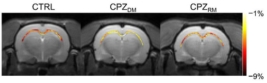 Figure 2 shows the mapping results of GluCEST signals in representative rats, with a focus on the CC region and overlaid on the unsaturated CEST image in each group. The GluCEST signals in the CC region changed hyperintensities as demyelination progressed, compared to the normal control. Moreover, the GluCEST image contrast decreased again in the CPZRM group compared to that in the CPZDM group, which did not differ significantly from that in the CTRL group, as shown in Figure 1b.