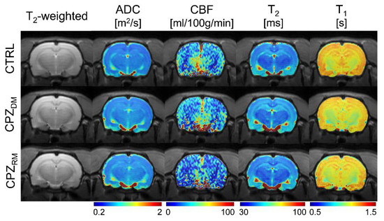 Figure 3. Reconstructed multi-parametric magnetic resonance (MR) images such as T2-weighted image, apparent diffusion coefficient (ADC), cerebral blood flow (CBF), and T1 and T2 maps in representative rats from the normal control (CTRL), demyelination (CPZDM), and remyelination (CPZRM) groups.